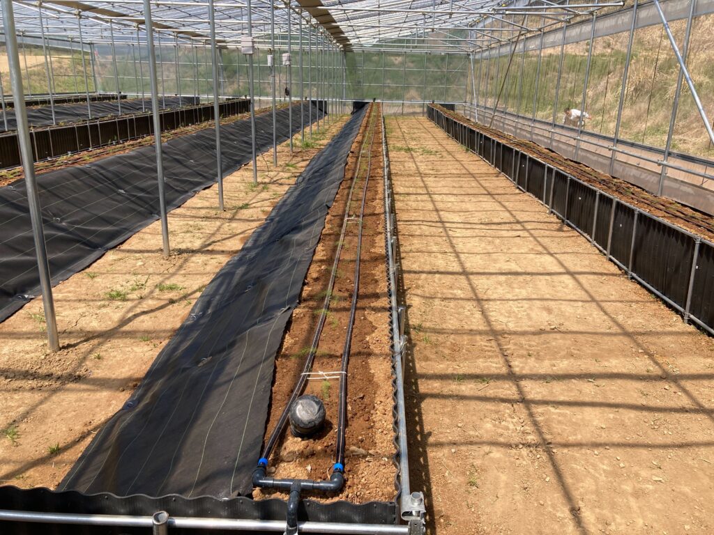 ルートレック・ファーム1では、軍艦巻きタイプを採用しましたが、今回は香川県農業試験場が開発した枠板式高畝栽培、軍艦巻きタイプと対比させる形で片流れ式と呼んでいる片面だけを枠板で固定する畝を採用しました。片流れ式にした理由は、軍艦巻きタイプに比べて、資材及び施工コストを下げることができます。2畝にすることで通路幅を広く取ることができ、通路の往復回数も減らすことができるので、作業性が改善されます。また、採光性も良くなることで、同じ間口で3畝を作るより、2畝の方が収量も上がります。将来的に、通路幅が1.8mあれば防除ロボットや収穫ロボットが入ることもできます。