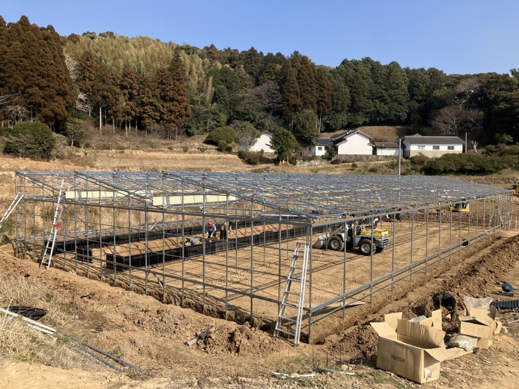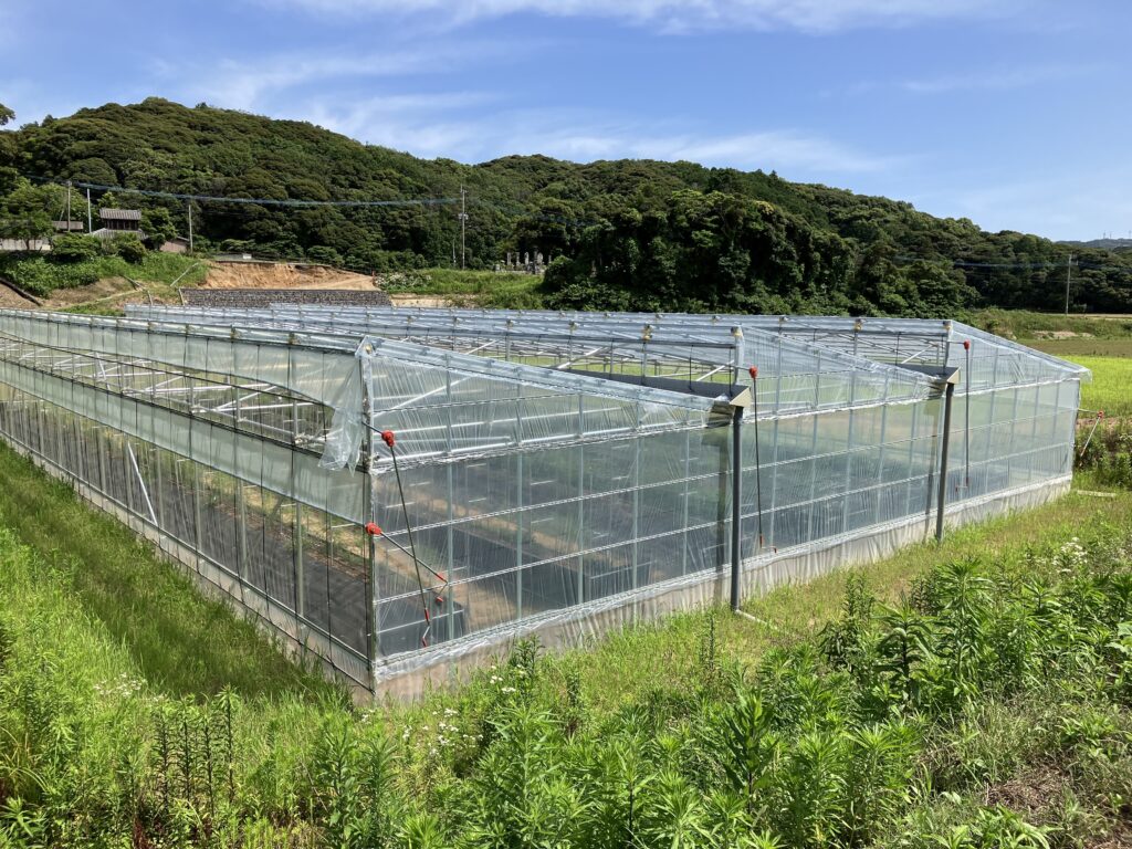 ルートレック・ファーム2は、農業資材高騰と気候変動への対策として、農研機構西日本農業研究センターと香川県農業試験場が共同開発した建設足場資材を使った「片屋根新型ハウス(通称:NNハウス)」を採用しました。