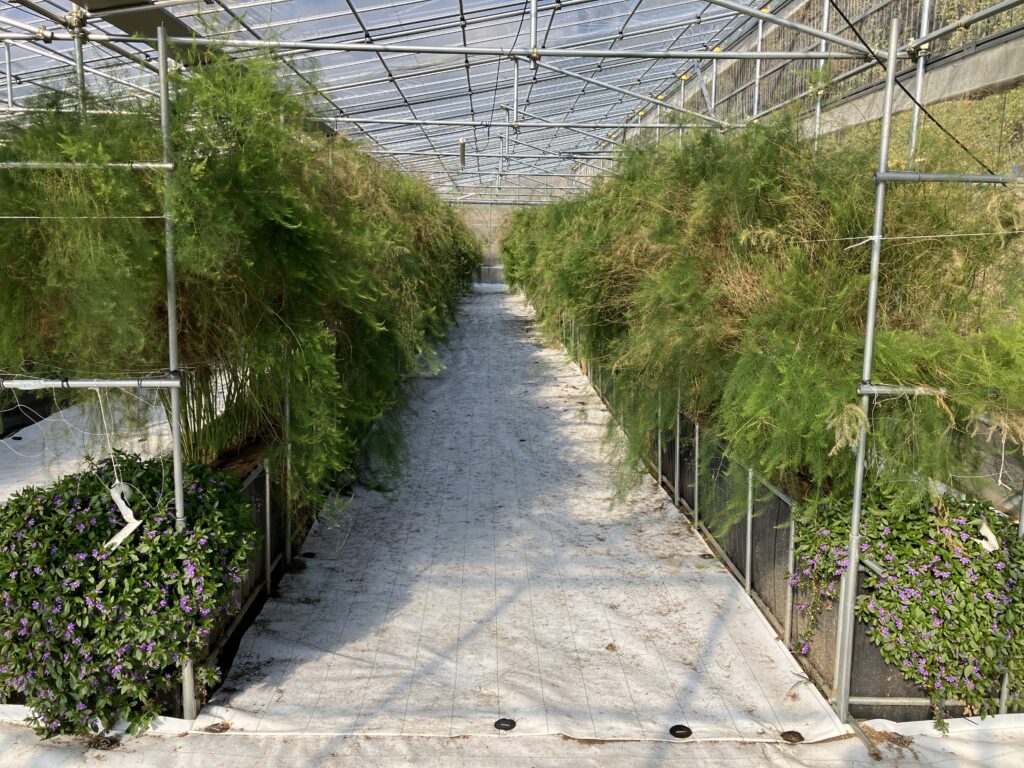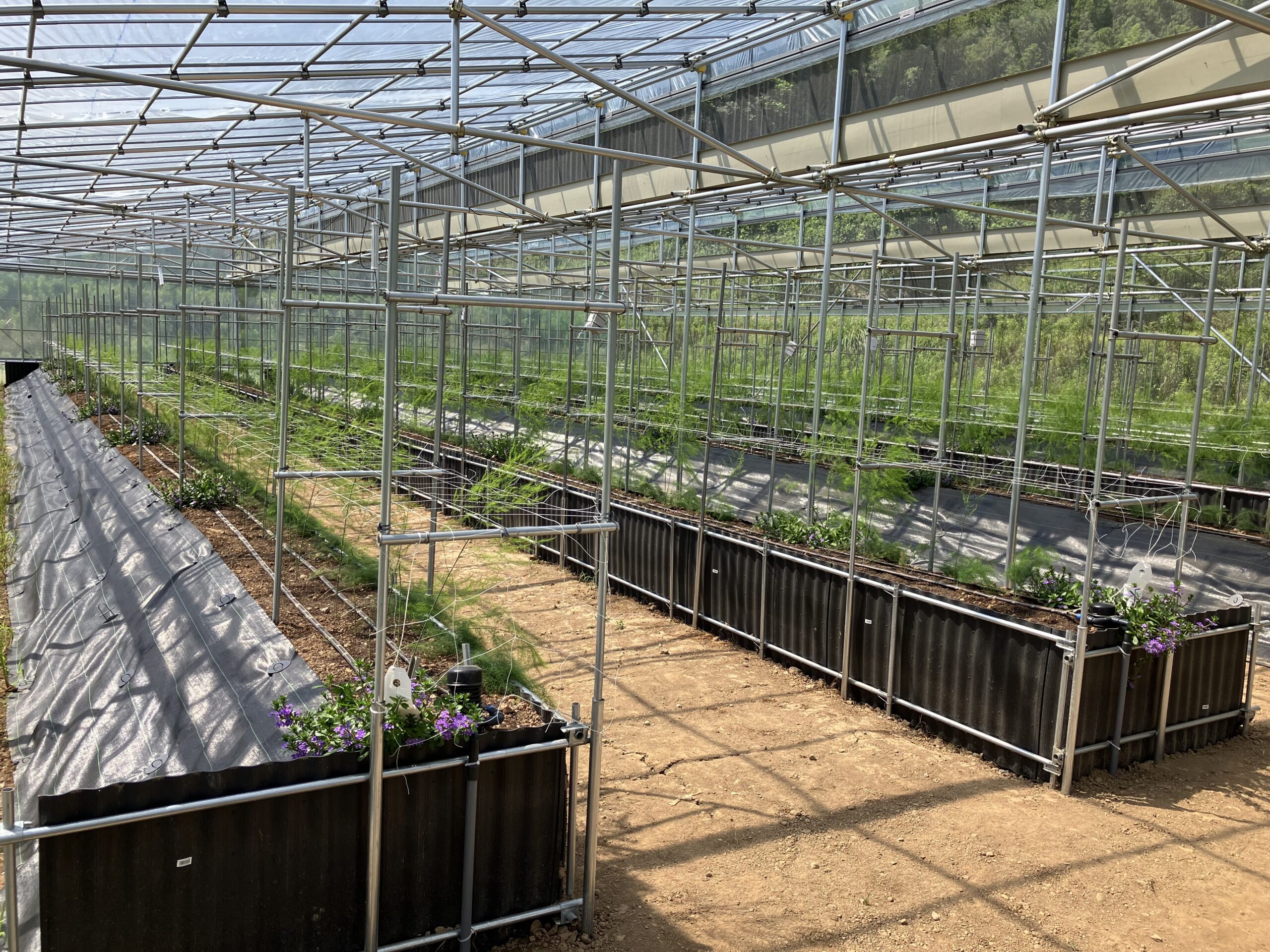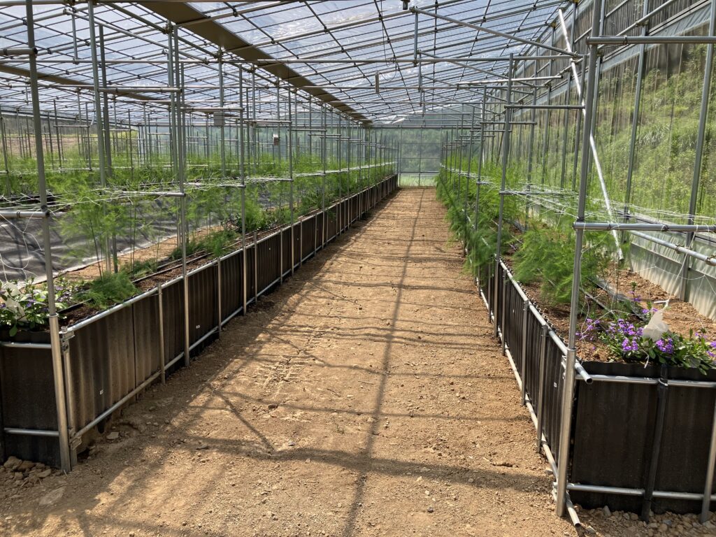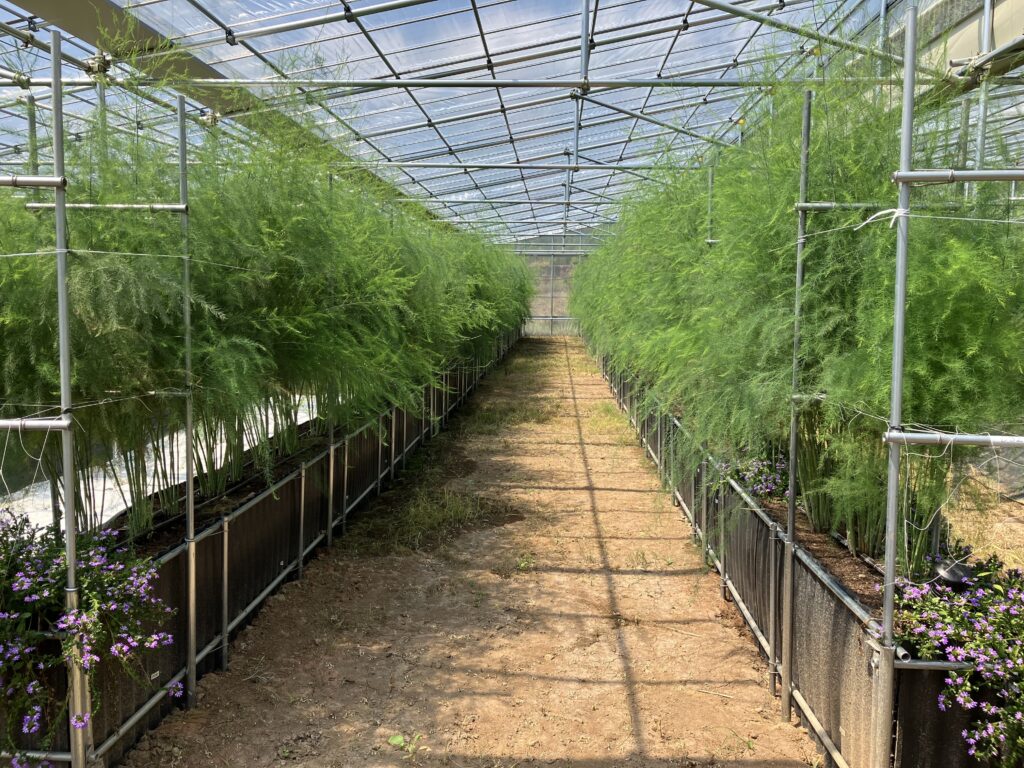 また、側窓が高く大きいため、自然換気にも優れており熱気がこもらない構造となっています。このような特徴はアスパラガスの高畝栽培と非常に相性が良く、樹が高く伸びるアスパラガスは伸び伸びと生育することができます。