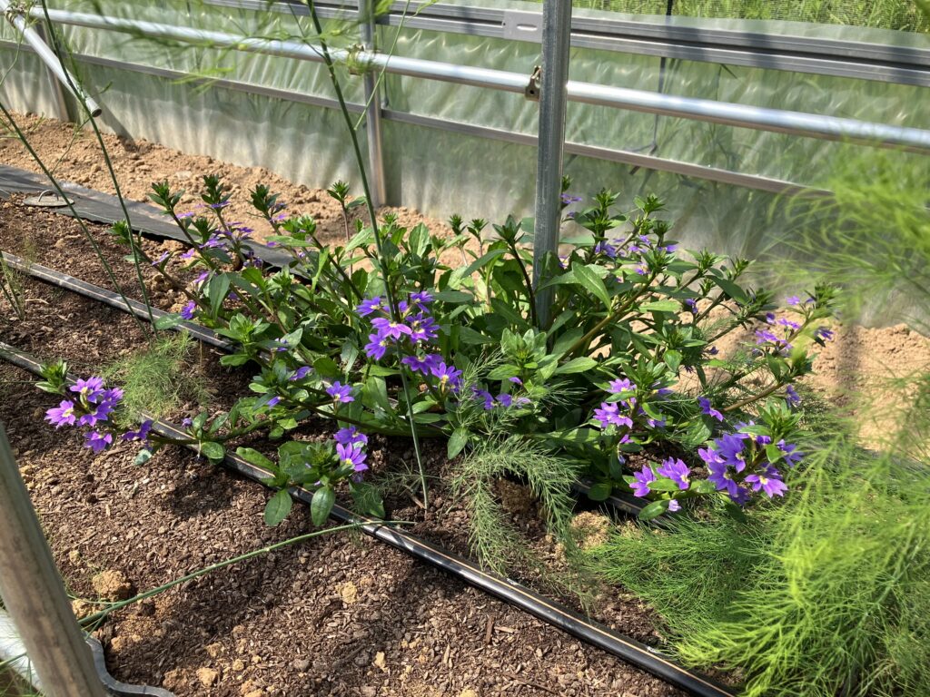 ルートレック・ファーム2では、長崎県農林技術開発センターで研究された成果である天敵を活用した害虫管理技術体系を導入しました。本技術では、害虫であるアザミウマやコナジラミの天敵であるスワルスキーカブリダニ×天敵温存植物スカエボラを導入し、天敵に影響の少ない殺虫剤を組み合わせることで、夏期の殺虫剤の散布回数を半減させながら、慣行防除と同等のコスト・効果を得られることができます。減農薬だけでなく、夏期の農薬散布回数が減ることで、作業車の負担を減らすことができます。