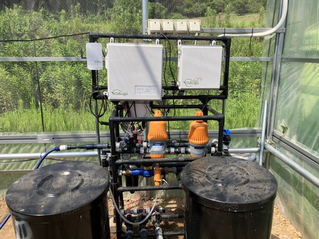 環境制御のために、自社製品であるハイエンドモデルのゼロアグリPlusを導入しています。ゼロアグリPlusでは、各センサーから得られた環境情報を元に、潅水・施肥・自動巻き上げ機(側窓・天窓)を自動で制御しています。